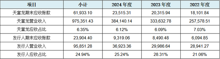 从上表可见,发行人应收占收入比分别为21.06%、28.31%、25.24%,平均占比值为24.94%,而天富龙应收占收入比分别为7.03%、6.09%、6.12%,平均占比为6.35%,发行人各期值分别为天富龙的3.00倍、4.65倍、4.12倍,其综合平均值也为天富龙的3.93倍,约为四倍左右的水平,从该项可比指标的可比结果来看,发行人期末应收占比可能存在相对过高的问题。