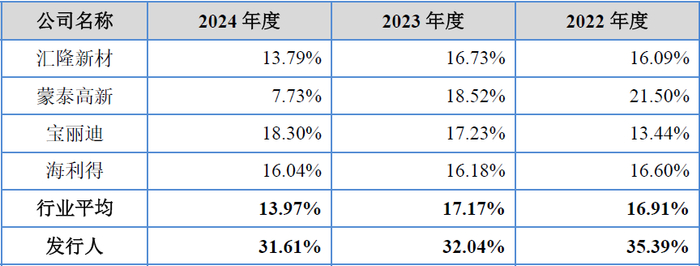 从上表可见,发行人的综合毛利率分别为35.39%、32.04%、31.61%,不但为可比企业中的最高水平且为行业各年平均值16.91%、17.17%、13.97%的2倍左右水平,毛利率水平作为反映上市盈利能力的首要指标,发行人可能缺少理由地为同行可比对手的2倍的客观性自然也难以考究。
