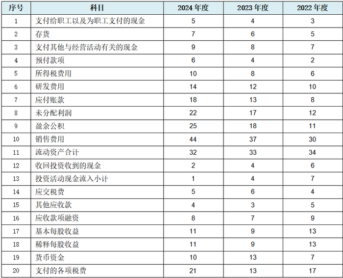 从上表可见,就利润表数据而言,如前文所述发行人因2024年度存在收入较为明显的翘尾现象,故发行人未出现明显的营业收入与营业成本相关数据的规律性变化,但利润表中仍出现了销售费用、研发费用及所得税费用等较为关键的5项数据规律性变化。就资产负债表数据而言,发行人出现较具代表性的存货、应付账款及未分配利润等10项较为核心资产负债表数据数据的规律性变化,其中的存货数据与营业成本相关。就现金流量表数据而言,发行人出现以支付给职工以及为职工支付的现金及支付的各项税费为代表的5项现金流量科目数据规律性变化。