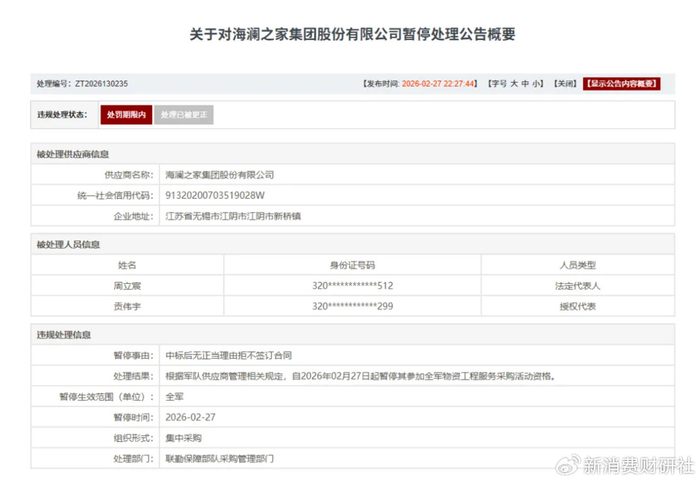 军队采购网发布的《供应商违规行为处理公告》显示,海澜之家集团股份有限公司因“中标后无正当理由拒不签订合同”,被联勤保障部队采购管理部门处罚,暂停其参加全军采购活动的资格,为期三年。公司法定代表人周立宸及其授权代表贡伟宇也被一并处理。