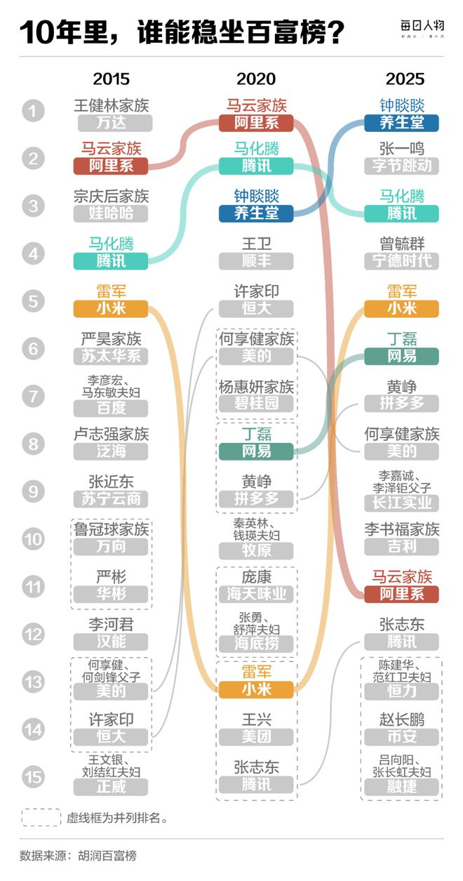 本期数据栏目,我们回顾了从2015年到2025年的胡润中国百富榜,试图看清这10年间中国的财富流向和消费变迁。