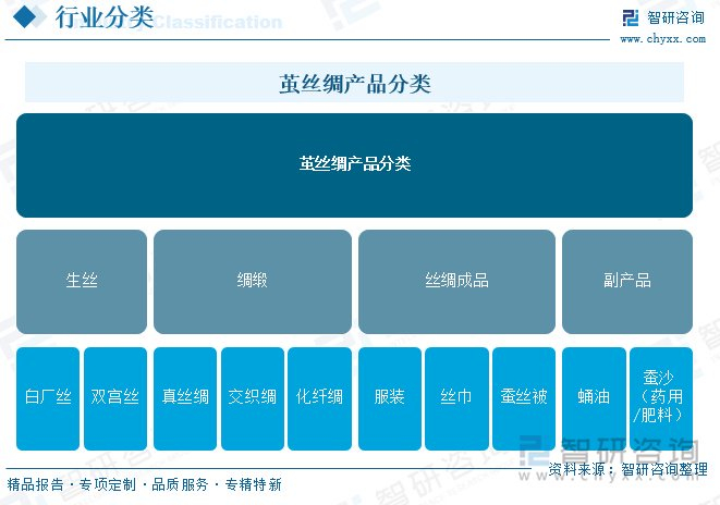 茧丝绸产品可以分为生丝、绸缎、丝绸成品、副产品等类别。其中,生丝又可分为白厂丝、双宫丝;绸缎可分为真丝绸、交织绸、化纤绸;丝绸成品可分为服装、丝巾、蚕丝被等。
