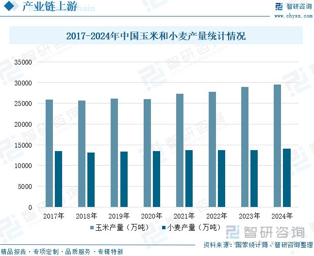 聚乳酸纤维以玉米、小麦等淀粉类作物为原料,经发酵转化为乳酸,再通过缩聚和熔融纺丝制成。这种生产方式使纤维具有生物可降解性,废弃后可在自然环境中被微生物分解为二氧化碳和水。玉米和小麦是全球两大主要粮食作物,对于保障人类粮食安全至关重要。近年来,得益于农业科学技术的进步,中国玉米和小麦种植面积不断扩大,带动产量稳步增长。国家统计局数据显示,中国玉米产量从2017年的25907.07万吨增长至2024年的29491.69万吨,年复合增长率为1.87%;小麦产量从2017年的13424.13万吨增长至2024年的14009.94万吨,年复合增长率为0.61%。随着未来玉米和小麦产量的进一步提升,将为下游聚乳酸纤维行业的规模化发展创造更有利的条件。