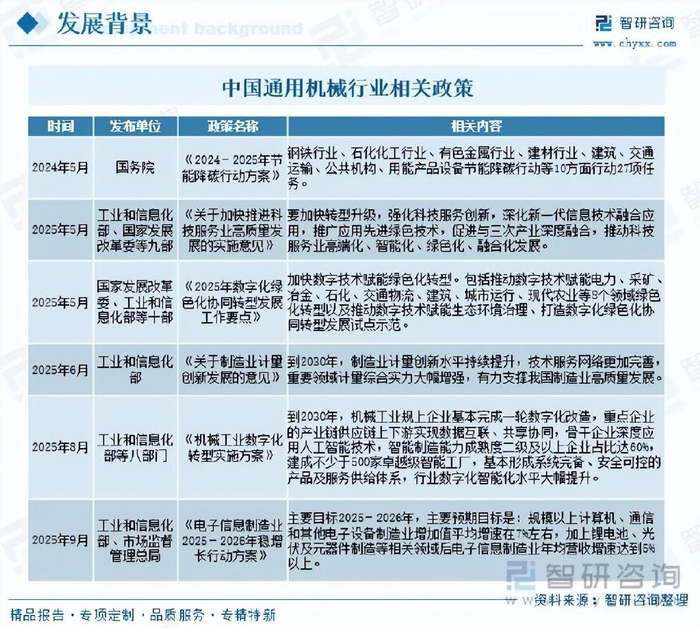 通用机械是工业体系中应用最广泛、基础性最强的一类机械装备,它是连接原材料加工、中间产品制造与最终产品组装的关键纽带,支撑着国民经济的正常运转,因此,我国高度重视通用机械行业发展,相继发布《2024-2025年节能降碳行动方案》《关于加快推进科技服务业高质量发展的实施意见》《2025年数字化绿色化协同转型发展工作要点》《关于制造业计量创新发展的意见》《机械工业数字化转型实施方案》《电子信息制造业2025-2026年稳增长行动方案》等一系列政策支持、鼓励和规范行业发展,为我国通用机械行业发展提供了良好的政策环境。