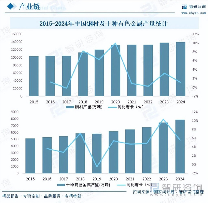 钢铁是生产通用机械最主要原材料,广泛用于制造机械结构件和零部件,而铝、铜等有色金属因其具有良好的导电性、导热性和耐腐蚀性,常用于制造电气元件、轴承等,据国家统计局数据显示,2024年我国钢材产量达139967.4万吨,同比增长1.15%;十种有色金属产量达7918.8万吨,同比增长5.60%,我国钢材、有色金属持续增产为通用机械行业发展提供了充足的原材料保障。