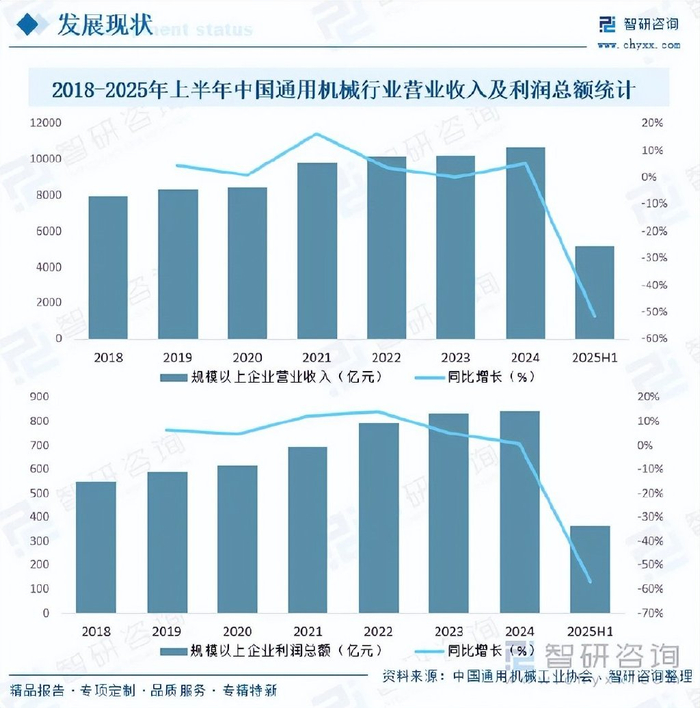 内容概要:通用机械广泛应用于石油、化工、电力、冶金等领域,是国民经济的基础产业,近年来,随着我国道路、桥梁、水利工程等基础设施建设的持续推进,带动通用机械市场需求持续增长,此外,随着风电、光伏、核电等新能源产业飞速发展,对通用机械的需求也在不断增加,如:核电站的建设需要大量的泵、阀门、压缩机等通用机械设备,另外,“双碳”目标指引下,我国污水处理、废气治理等环保产业迅速崛起,也为通用机械带来新的增长空间,据中国通用机械工业协会数据显示,2025年上半年我国通用机械行业8842家规模以上企业营业收入已完成5218.15亿元,同比增长4.45%,实现利润总额365.98亿元,同比增长3.95%,行业营收增速高于2024年同期及全年水平。