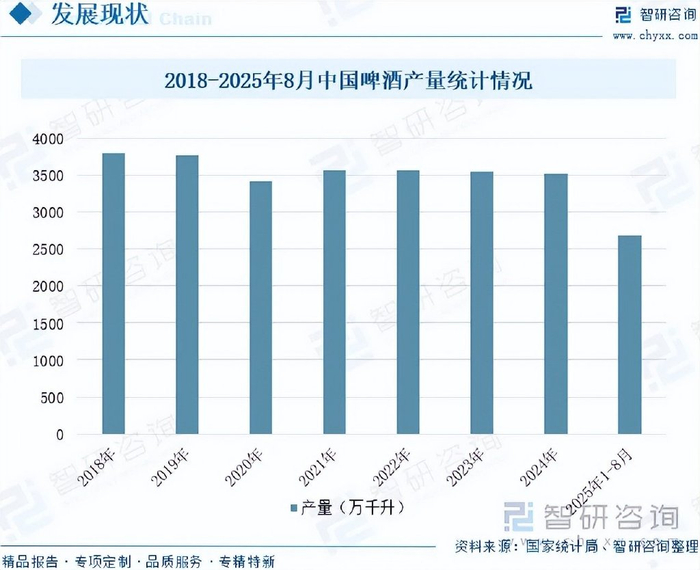 啤酒是人类最古老的酒精饮料,是水和茶之后世界上消耗量排名第三的饮料。啤酒于20世纪初传入中国,属外来酒种。21世纪以来,我国啤酒产业规模增速放缓,行业内龙头企业打通国际市场,整合行业资源,企业间竞争压力增大,我国啤酒产量持续上升,成为全球最大的啤酒市场。目前,中国啤酒酿造工艺趋于成熟,行业规模领先全球,但我国啤酒缺乏多样性,且以中低端产品为主,进入行业的壁垒较低,导致大部分企业没有核心竞争力,容易被外来企业收购。2020年,受“新冠疫情”影响,中国啤酒产量下降至3411.11万千升;2021-2022年,我国啤酒产业复苏,产量缓慢提升。2023-2024年,受即饮场景持续萎缩、传统渠道贡献率下降、酒精消费意愿降低等多种因素影响,啤酒产量有所下滑。2024年中国啤酒产量下降至3521.3万千升,同比下降0.96%。2025年以来,中国啤酒行业呈现出“量稳质升”的态势,整体市场已经企稳,前8个月,中国啤酒产量为2683.3万千升,同比增长1.73%。未来,随着产品结构持续优化和消费场景不断拓展,中国啤酒产量将保持稳定态势。