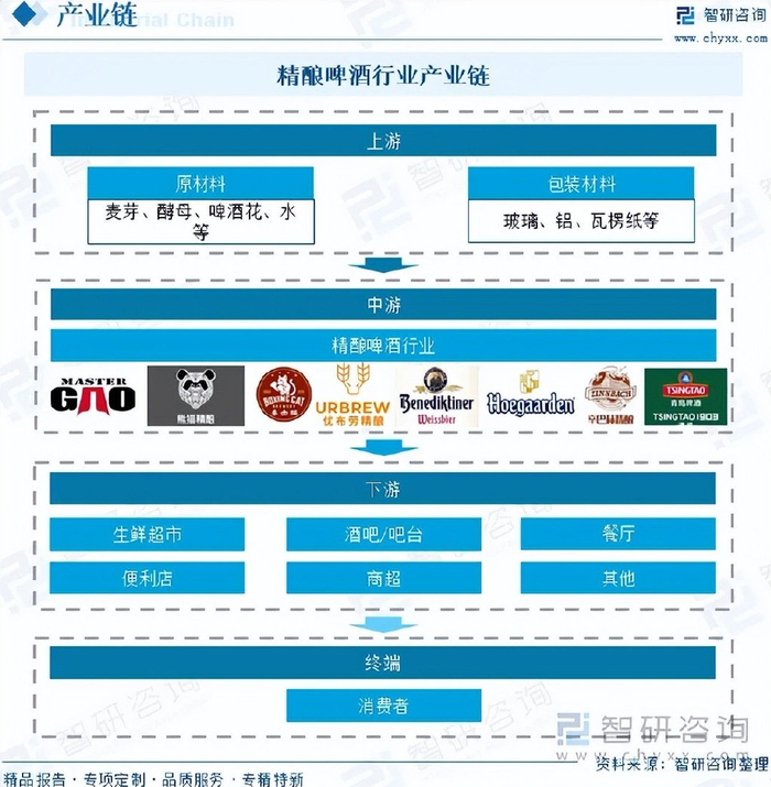 精酿啤酒产业链上游为原材料和包装材料,其中,原材料包括麦芽、酵母、啤酒花、水等;包装材料包括玻璃、铝、瓦楞纸等。产业链中游为精酿啤酒设备制造商、酿造厂商和包装商。产业链下游为精酿啤酒的销售渠道,包括生鲜超市、酒吧/吧台、餐厅、便利店、商超等,终端为消费者。