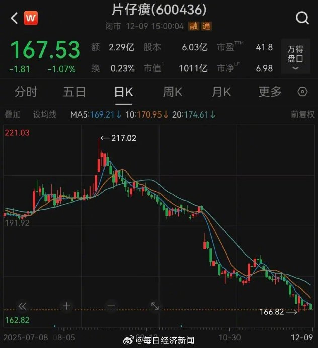 截至2025年12月9日,片仔癀股价报167.53元/股,较2021年高点跌超60%,市值蒸发约1889亿元。