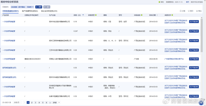 吸氧管也被称为鼻导管或鼻氧管,是一种用于输送氧气的医疗器械,主要用于帮助缺氧患者改善呼吸状况,该类耗材也属于临床常用的耗材。其在耗材中标分析系统中共收录到43831条信息,该耗材的价格差幅也较大,最高中标价达到31666元,最低中标价则不足1元,为0.19元。