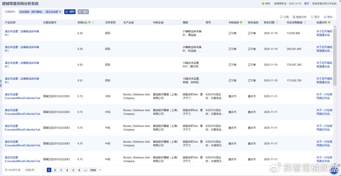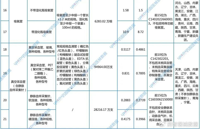 真空采血管是本次5类耗材中,带量采购数据库中收录最多的1类耗材,共收录141870条信息,收录的耗材中标数量同样也超过了10W条。