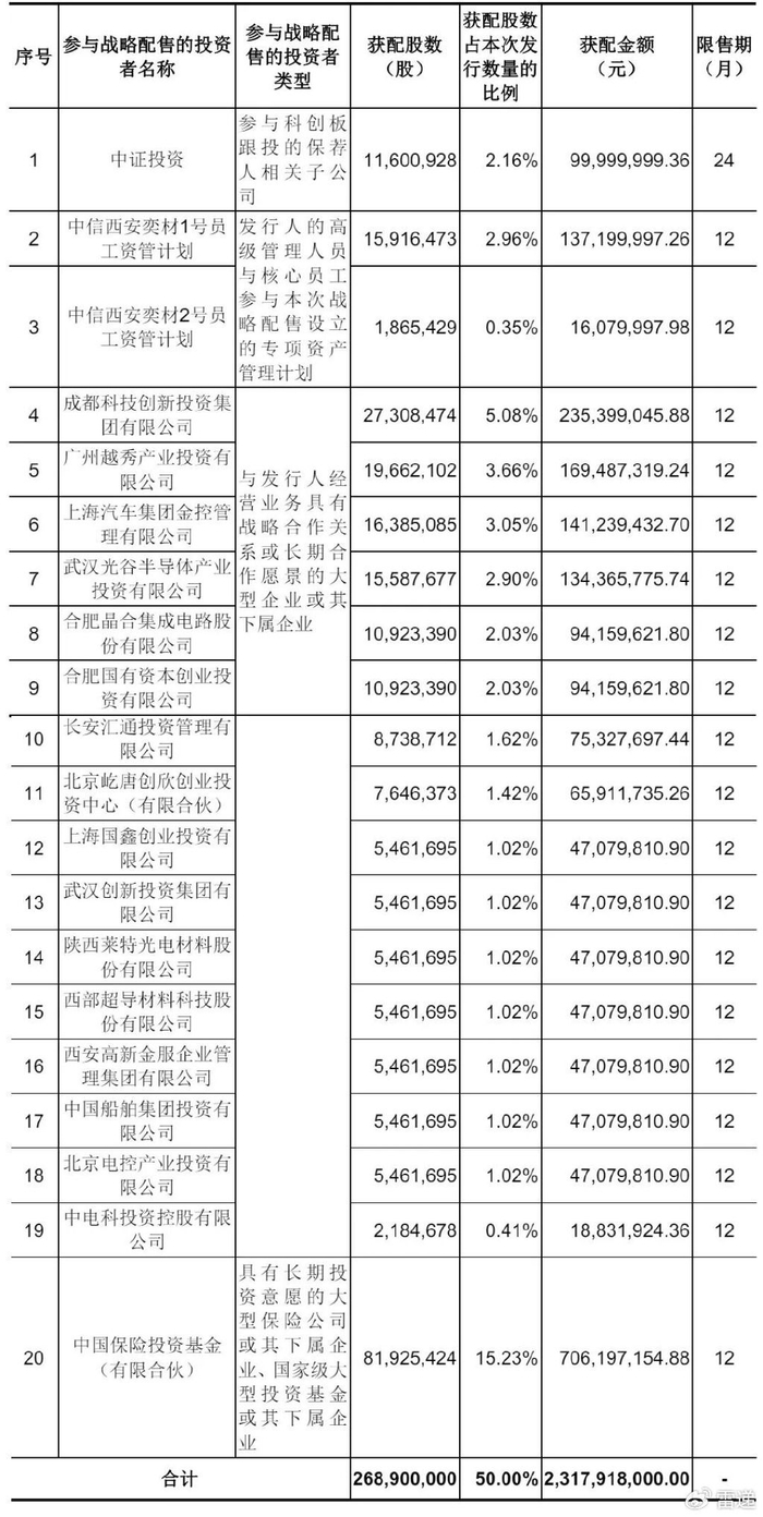 上海国鑫创业投资有限公司、武汉创新投资集团有限公司、陕西莱特光电材料股份有限公司、西部超导材料科技股份有限公司、西安高新金服企业管理集团有限公司、中国船舶集团投资有限公司、北京电控产业投资有限公司分别认购4708万元,中电科投资控股有限公司认购1883万元,中国保险投资基金(有限合伙)认购7.06亿元。