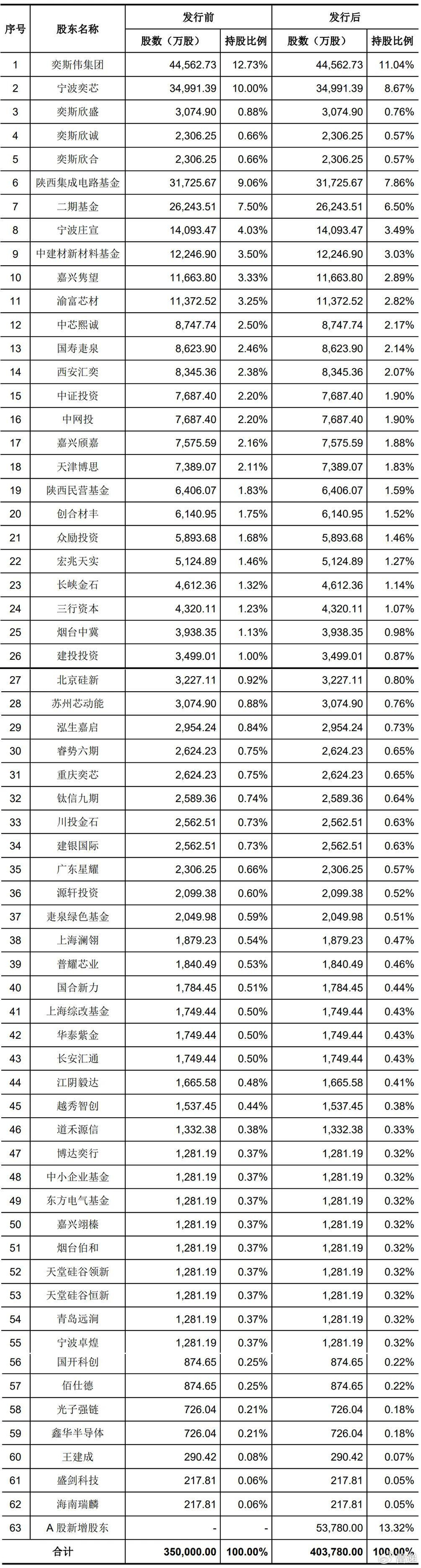 IPO后,奕斯伟集团持股为11.04%,宁波奕芯持股为8.67%,奕斯欣盛持股为0.76%,奕斯欣诚、奕斯欣合分别持股为0.57%,陕西集成电路基金持股为9.06%,二期基金持股为6.5%,宁波庄宣持股为3.49%,中建材新材料基金持股为3.03%;