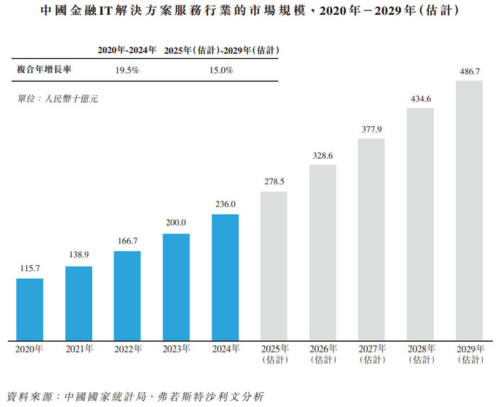 根据弗若斯特沙利文(Frost & Sullivan)的报告,中国金融IT解决方案服务行业的市场规模由2020年的人民币1,157亿元增长至2024年的人民币2,360亿元,复合年增长率为19.5%。2025年至2029年,该行业预计将以15.0%的复合年增长率增长,预计到2029年整体市场规模将达到人民币4,867亿元。