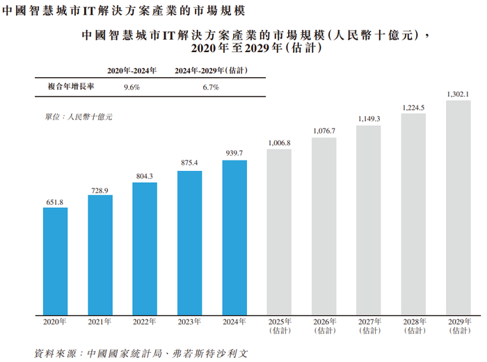 来源:招股书中国智慧城市IT解决方案行业的市场规模从2020年的6,518亿元人民币增长至2024年的9,397亿元人民币,年均复合增长率为9.6%。从2024年到2029年,市场规模预计将以6.7%的年均复合增长率上升,预计2029年市场规模将达到人民币13,021亿元。本公司于中国智慧城市IT解决方案行业所占市场份额不到1%(0.00001%)(按收入计)。