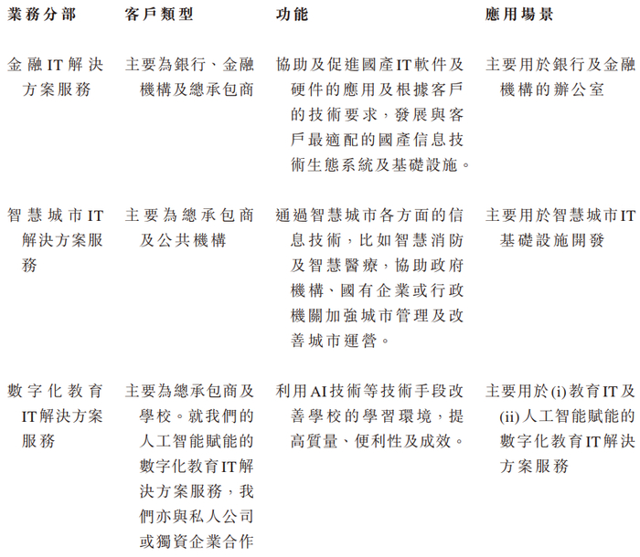 公司的IT解决方案服务大体上可分为三个类别,即(i)金融IT解决方案服务;(ii)智慧城市IT解决方案服务;及(iii)数字化教育IT解决方案服务。按弗若斯特沙利文的数据显示,于2024年,公司在华南地区金融信创行业中以收入计位列第五,市场份额3.9%。