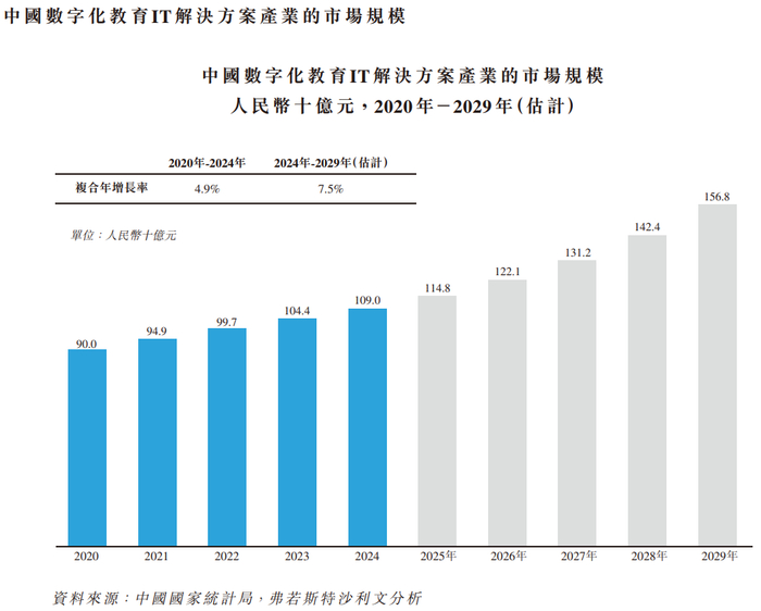 来源:招股书中国数字化教育IT解决方案整体市场规模由2020年的人民币900亿元增长至2024年的人民币1,090亿元,复合年增长率为4.9%。2024年至2029年,市场规模预计年复合增长率为7.5%,预计2029年市场规模将达到人民币1,568亿元。本公司于中国数字化教育IT解决方案行业所占市场份额不到1%(0.005%)(按收入计)。