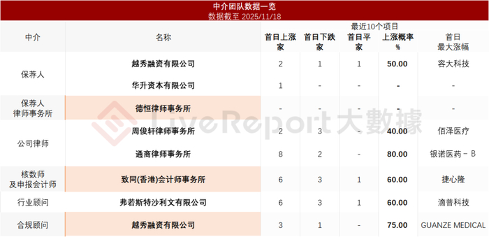来源:招股书据LiveReport大数据统计,河南联合信息中介团队共计8家,其中保荐人2家,近10家保荐项目数据表现有待提升;公司律师共计2家,综合项目数据表现普通。整体而言中介团队历史数据表现缺乏亮点。