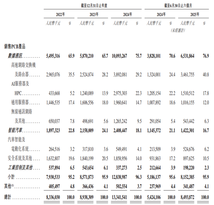 来源:招股书截至2022年、2023年及2024年12月31日止年度,以及截至2024年及2025年6月30日止六个月,PCB产品销售分别占公司总收入95.2%、95.9%、96.3%、95.6%及95.9%。下表列出公司在所示期间按应用领域划分的收入明细: