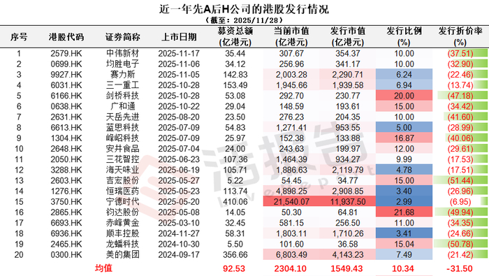 截至2025年11月28日,近一年成功赴港上市的A股公司合计20家,平均发行折价率约为31.50%。