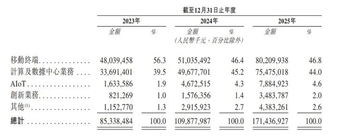 公司的收入来自以下产品:(i)移动终端,主要包括智能手机、平板计算机及智能穿戴产品,(ii)计算及数据中心业务,主要包括个人计算机及数据基础设施产品。