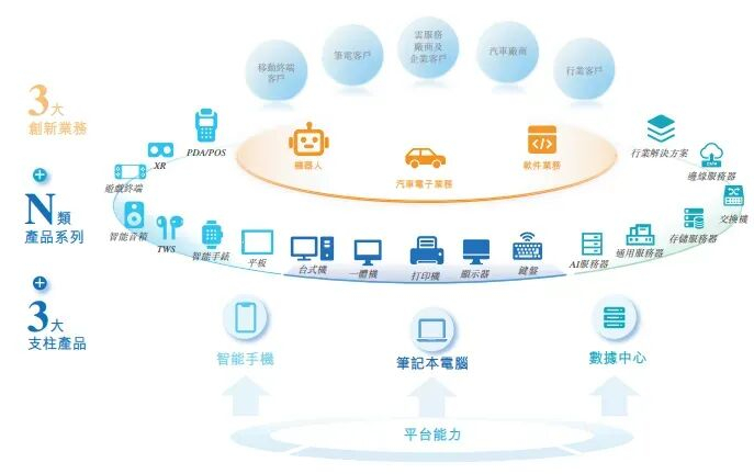 公司深刻洞察和理解全球品牌客户多样化、多场景的产品需求,战略性布局了「3+N+3」智能产品矩阵:构建了智能手机、笔记本计算机、服务器3大支柱型产品。基于此,公司已拓展出移动终端及AIoT、计算业务及数据中心业务三大产品系列。同时,公司持续探索汽车电子、软件业务和机器人3大创新业务领域的新机遇。