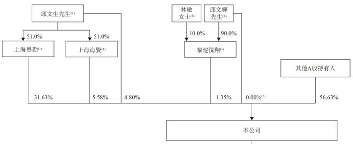 邱文生先生直接持股4.80%,并通过上海奥勤、上海海贤分别持股31.63%、5.58%。其兄弟邱文辉先生为一致行动人,直接持有少量股份,另通过福建悦翔持股1.35%。二人合计拥有约43.37%的投票权。