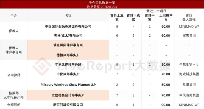 据LiveReport大数据统计,华勤技术中介团队共计9家,其中保荐人2家,近10家保荐项目数据表现尚可;公司律师共计3家,综合项目数据表现普通。整体而言中介团队历史数据表现中规中矩。