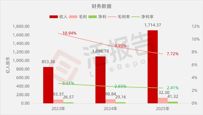 收入分别约为人民币853.38亿、1098.78亿、1714.37亿,2025年同比+56.02%;