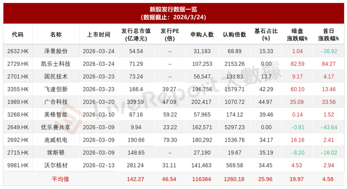 2026年以来,港股市场已有34只新股上市(包括1只介绍上市),合计募资约1044.93亿港元。最近一周(3月22日~3月28日),4家上市,7家招股,0家聆讯,21家递表。