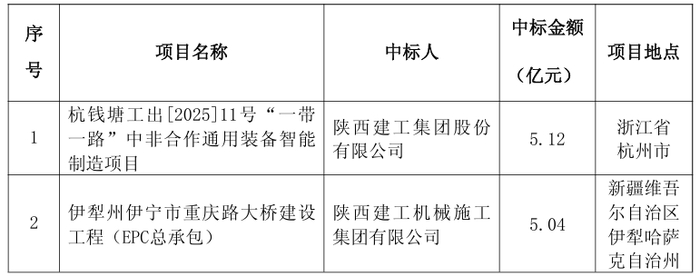 11月12日,陕建股份(600248)发布公告,2025年10月,公司及下属子公司中标了两个超过5亿元的施工项目。具体情况如下: