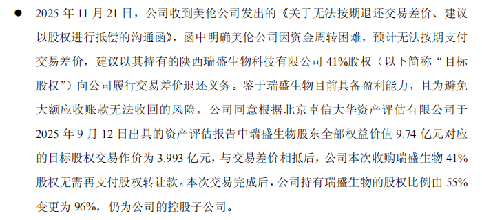 海利生物宣布,拟收购子公司陕西瑞盛生物科技有限公司(下称“瑞盛生物”)剩余的41%股权。但这并非一次意气风发的战略加码,而是一次略显苦涩的“账务保全”:因为卖家美伦公司实在拿不出约4亿元的业绩补偿款,只能把手里的股权抵给海利生物。