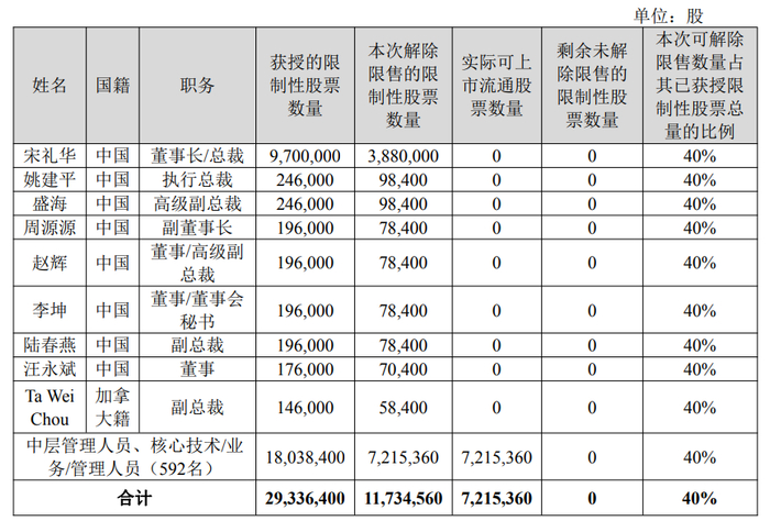 本次解除限售的第一类限制性股票数量为1173万股,占公司目前股本总额16.73亿股的0.7016%。实际可上市流通股票数量为722万股,占公司目前股本总额的0.43%。本次申请解除限售的激励对象共601名,解除限售的限制性股票上市流通日为2025年12月5日。具体情况如下: