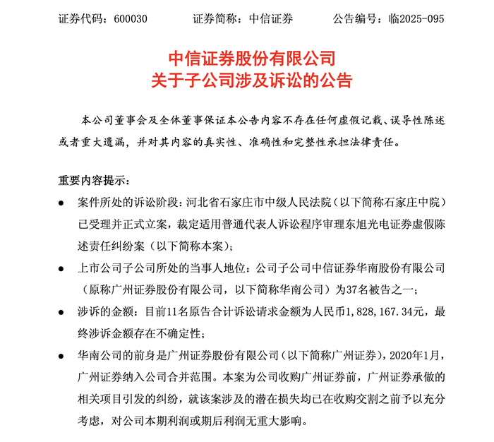 中信证券在公告中表示,中信证券华南的前身是广州证券,2020年1月纳入公司合并范围。本案系公司收购广州证券前,广州证券承做的相关项目引发的纠纷,相关潜在损失已在收购交割前充分考虑,对公司本期及期后利润无重大影响。