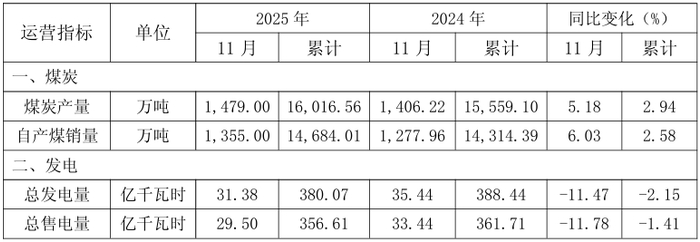 12月8日,陕西煤业(601225)发布公告,2025年11月主要运营数据显示,煤炭产量为1479万吨,同比增加5.18%,累计产量为1.6亿吨。