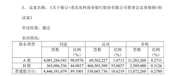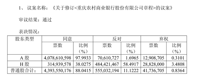 然而,即便H股股东的反对态度坚决且集中,在渝农商行特殊的股权结构面前,这些反对毫无效果。数据显示,渝农商行A股流通股占比高达77.9%,H股仅占22.1%;而在本次股东大会出席的股份中,A股股东持有的表决权股份总数占比进一步提升至83.4%,H股则仅占16.6%。这种悬殊的力量对比意味着,即便H股股东全员反对,也难以撼动A股大股东意志主导的决策结果。