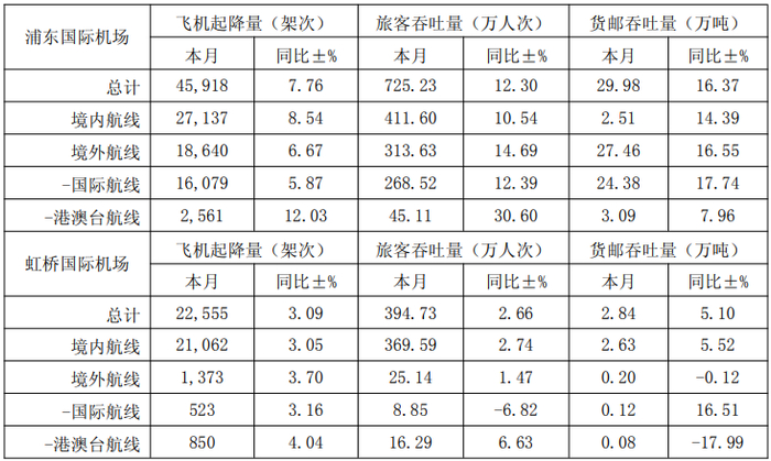 虹桥国际机场的飞机起降量为22,555架次,同比增长3.09%;旅客吞吐量为394.73万人次,同比增长2.66%;货邮吞吐量为2.84万吨,同比增长5.10%。