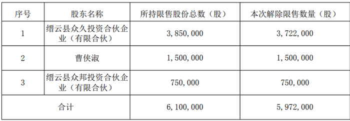 此次解除限售的股东共有3户,解除限售股份数量为597万股,占公司总股本的5.48%。公司首次公开发行时的总股本为1.09亿股,其中有限售条件流通股占78.08%,无限售条件流通股占21.92%。