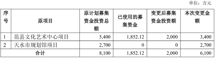 3月25日,风语筑(603466)发布公告,公司决定变更部分可转债募集资金投资项目。原项目包括范县文化艺术中心项目和天水市规划馆项目,计划募集资金投资总额为8100万元,现变更后新项目为东坡休闲农业产业园数字文旅项目和比亚迪南宁迪空间布展项目,拟投资总额合计6100万元。