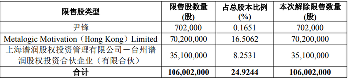 3月26日,浙江华远(301535)发布公告,披露关于首次公开发行前已发行股份限售股上市流通的事项。本次解除限售股东户数共计3户,解除限售股份数量为1.06亿股,占公司总股本的24.9244%。解除限售股份的上市流通日期为2026年3月30日。