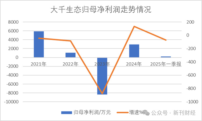 具体来看,大千生态营收规模呈现断崖式萎缩,从2021年超5亿元骤降至2023年的1亿元左右,三年累计跌幅近80%。更令人担忧的是,这种下滑趋势在2025年一季度仍未止住,营收同比继续下滑11.46%,仅实现0.22亿元收入,创下历史新低。