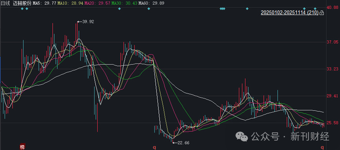 作为一家专注于高端智能装备系统和智慧物联系统的高新技术企业,迈赫股份的核心业务围绕机器人和物联网技术展开,产品主要应用于汽车、工程机械等领域。截至11月14日收盘,公司股价报25.21元,11月以来累计下跌3.31%,跑输同期大盘表现。
