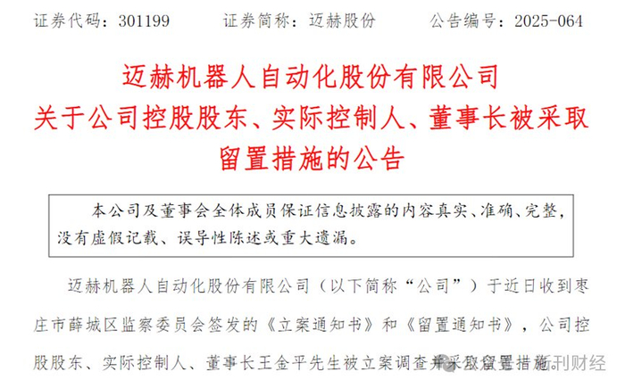 11月16日晚间,迈赫股份(301199.SZ)突然抛出一则重磅公告。公司于近日收到枣庄市薛城区监察委员会签发的《立案通知书》和《留置通知书》,公司控股股东、实际控制人、董事长王金平被立案调查并采取留置措施。