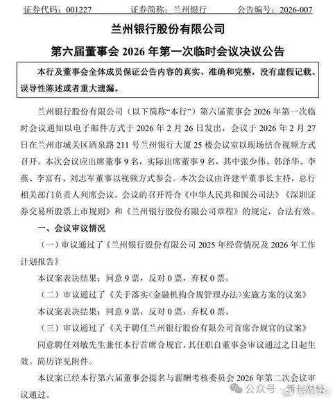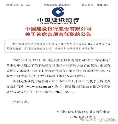 监管政策的硬性约束,是首席合规官密集上岗的核心驱动力。2024年12月,国家金融监督管理总局发布《金融机构合规管理办法》,明确要求金融机构在总部设立首席合规官,且该职位为高级管理人员,接受董事长和行长直接领导并向董事会负责,同时允许行长或其他高管兼任。2026年2月13日,农行行长王志恒、中行行长张辉同日兼任首席合规官;2月27日,建行行长张毅、交行首席风险官刘建军相继上任,浙商银行、兰州银行等中小银行也同步敲定人选。首席合规官任命进入集中落地阶段。