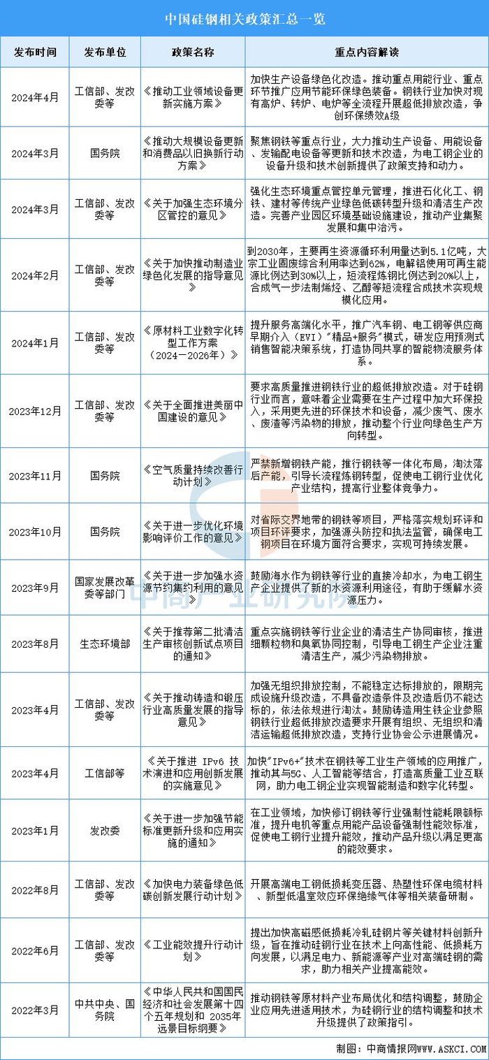 近年来,中国硅钢行业受到各级政府的高度重视和国家产业政策的重点支持。国家陆续出台了多项政策,鼓励硅钢行业发展与创新,《推动工业领域设备更新实施方案》《推动大规模设备更新和消费品以旧换新行动方案》《关于加强生态环境分区管控的意见》等产业政策为硅钢行业的发展提供了明确、广阔的市场前景,为企业提供了良好的生产经营环境。具体情况列示如下: