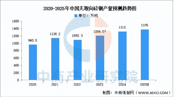 中商产业研究院发布的《2025-2030年中国无取向硅钢市场调查与行业前景预测专题研究报告》显示,据不完全统计,截至2024年底,我国现有无取向硅钢产能约1463.5万吨(不含停产产能),实际产量为1315万吨,产能利用率超过90%。中商产业研究院分析师预测,2025年产量将达1375万吨。