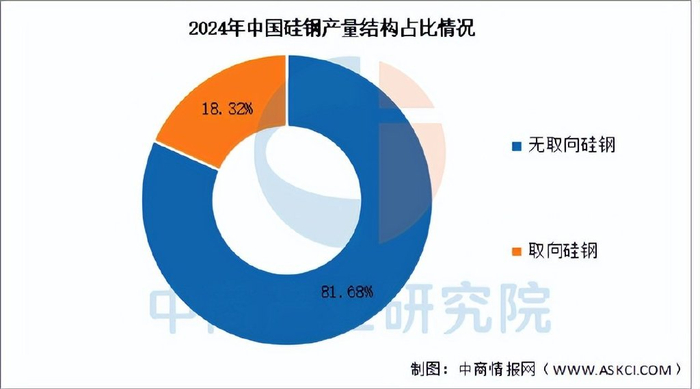 2024年我国硅钢产量1610万吨。其中无取向硅钢产量1315万吨,占总产量的81.68%,取向硅钢约占18.32%。