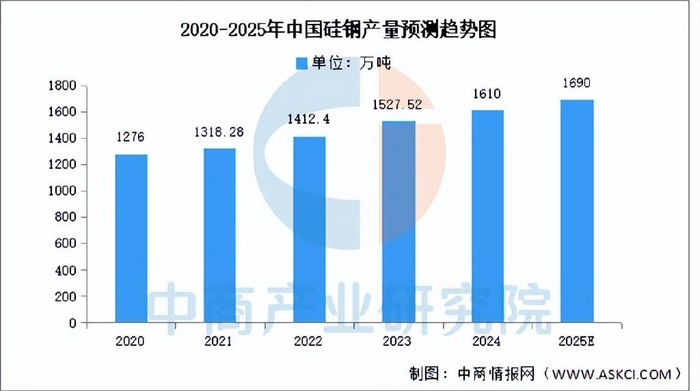 目前,我国硅钢在产能和产量上均居世界首位,硅钢从生产工艺、装备到产品开发等均取得巨大进步。中商产业研究院发布的《2025-2030年中国硅钢市场调查与行业前景预测专题研究报告》显示,2024年我国硅钢产量达到1610万吨,同比增长9%。中商产业研究院分析师预测,2025年中国硅钢产量将接近1700万吨。