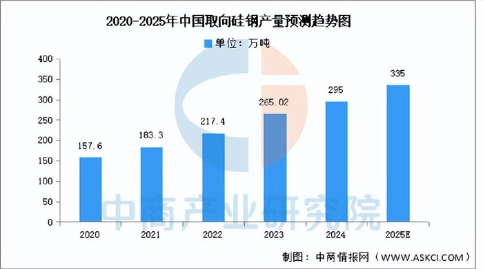 中商产业研究院发布的《2025-2030年中国取向硅钢分析及发展趋势研究预测报告》显示,近年来,我国取向硅钢产量持续增长,2023年取向硅钢产量为265.02万吨,占硅钢产量的17.35%。截至2024年底,我国取向硅钢实际产量为295万吨。中商产业研究院分析师预测,2025年中国取向硅钢产量将达335万吨。