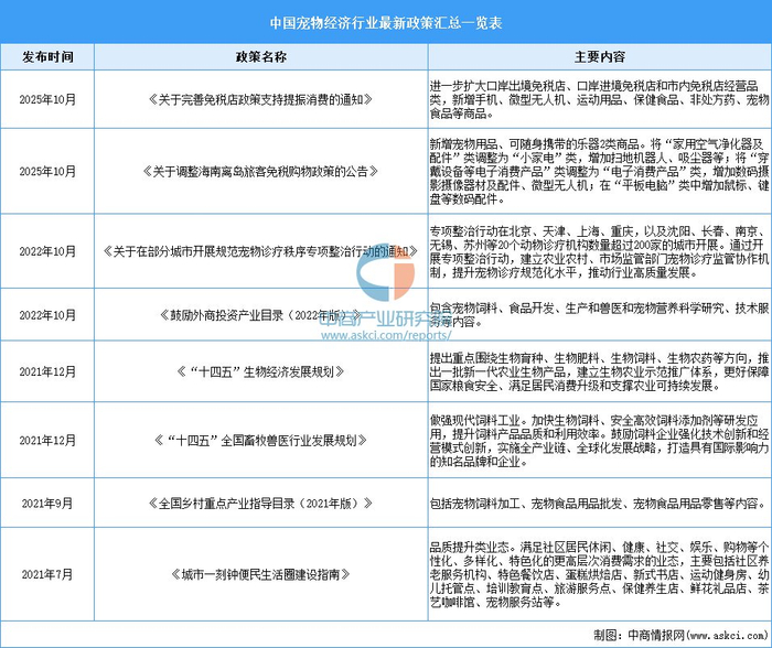 为更好激活宠物经济消费新动能,推进宠物相关行业规范健康发展,我国政府相关部门出台了《关于完善免税店政策支持提振消费的通知》《关于在部分城市开展规范宠物诊疗秩序专项整治行动的通知》《全国乡村重点产业指导目录(2021年版)》等一系列政策措施,为宠物经济产业的发展提供了有力的政策保障。